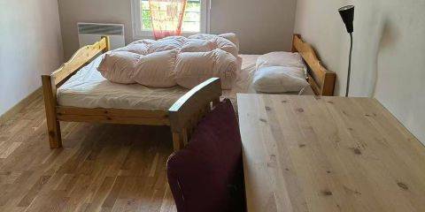 Petite maison individuelle T2 : - Cuisine séparée, - Salon (canapé BZ, table basse, rangement) - Chambre (lit double, armoire) - Salle de douche avec WC Accès à une buanderie et local vélos. Accès terrasse et jardin.